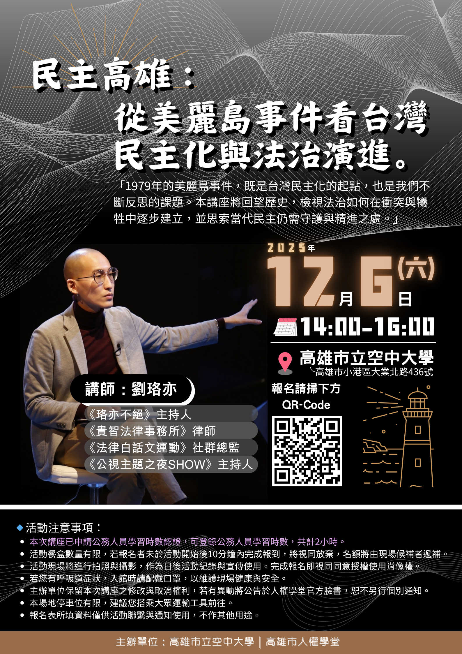 主旨:敬請貴單位協助公告本校人權學堂12月份辦理之「民主高雄:從美麗島事件看台灣民主化與法治演進」講座訊息,並鼓勵同仁踴躍參加,請查照。