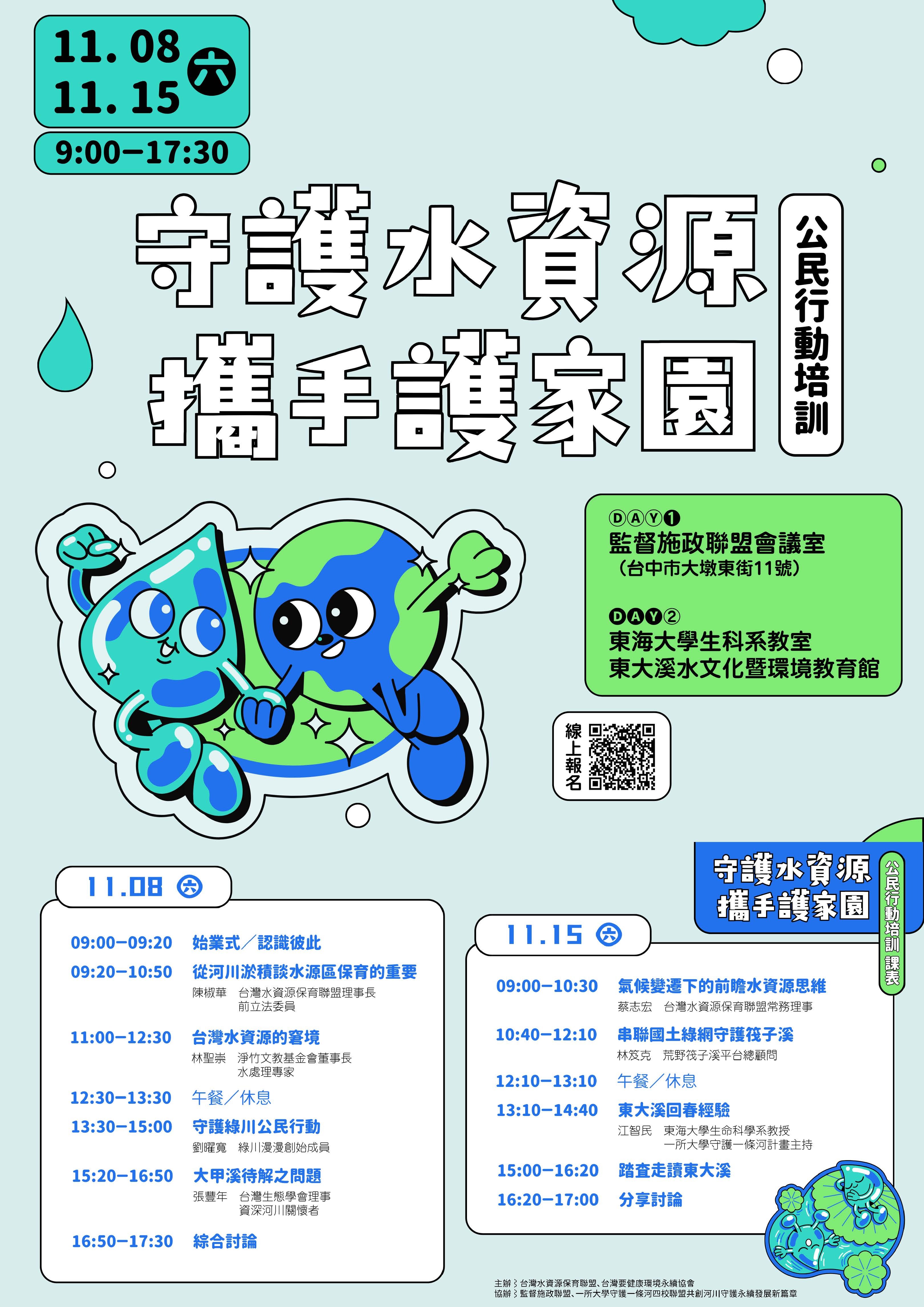 一、旨揭培訓係本聯盟與台灣要健康環境永續協會主辦,監督施政聯盟與一所大學守護一條河四校聯盟共創河川守護永續發展新篇章協辦。以「守護水資源 攜手護家園」為公民行動培訓主軸,透過7堂知識經驗講授、1場實地走讀,深入剖析台灣水資源的現況與面臨的挑戰,涵蓋氣候變遷、河川治理、地下水超抽、重大水利設施爭議等關鍵議題。歡迎高中職以上青年學生踴躍報名,增進水資源保育知識及裝備自我公民力。