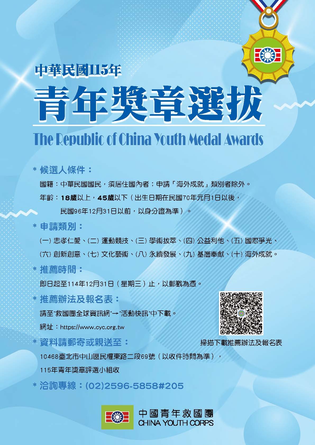 【學生成就中心轉知】救國團115年青年獎章選拔