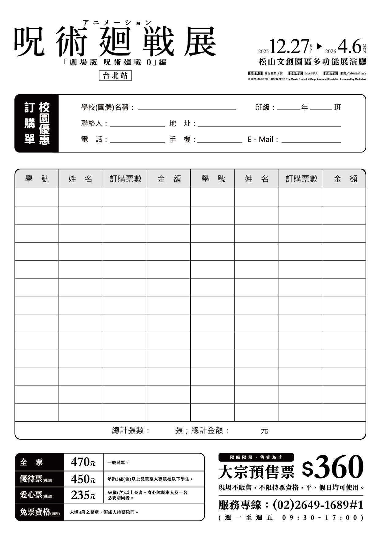 主旨:本公司訂於114年12月27日~115年4月6日於台北市松山文創園區多功能展演廳舉辦「咒術迴戰展《劇場版 咒術迴戰 0》篇」,敬請協助公告周知,鼓勵師生及家長踴躍參與,並規劃進行校外教學及其團體參觀之參考依據,請查照。
