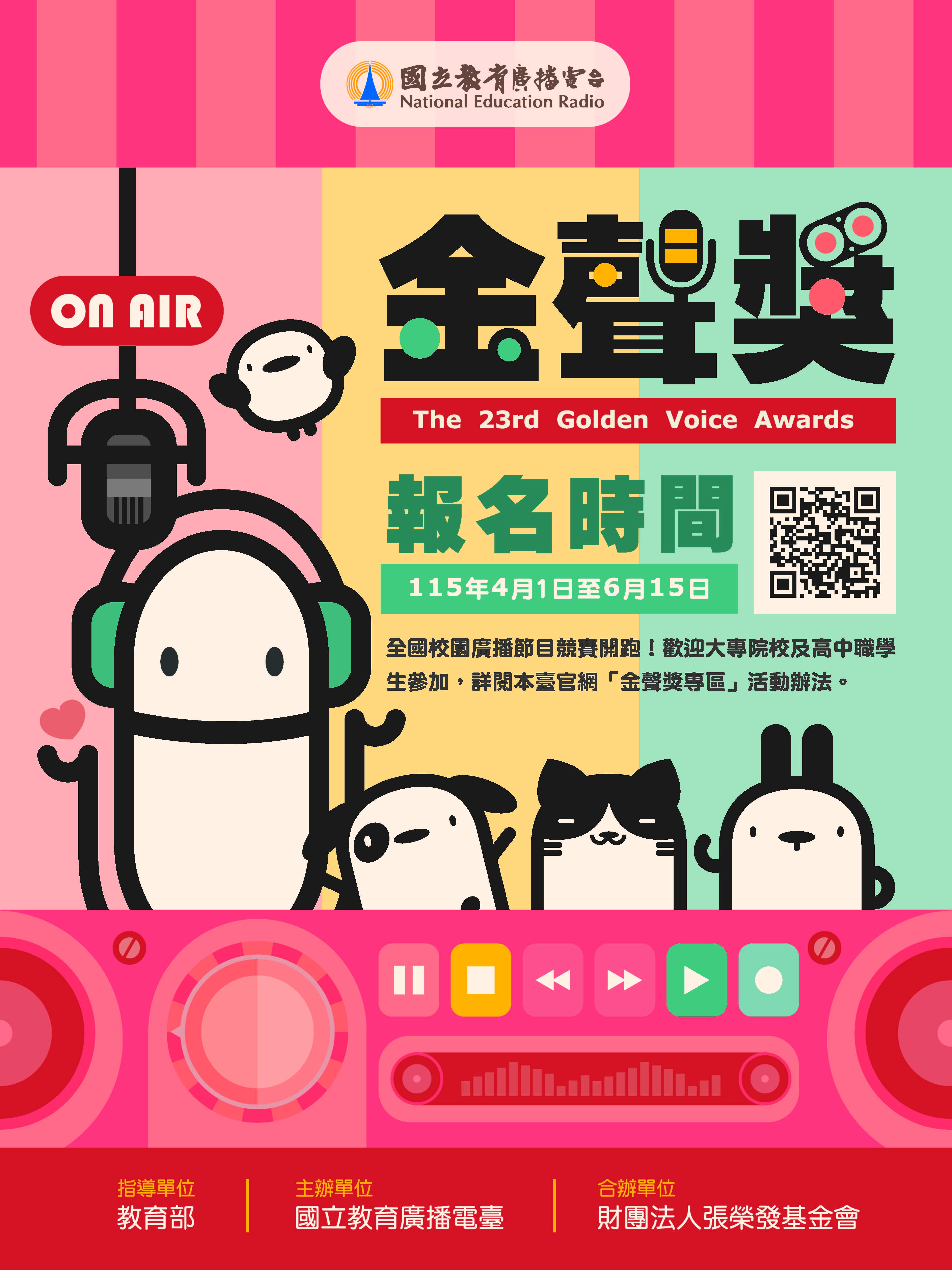 三、本活動採網路報名,報名日期自本(115)年4月1日(星期三)上午10時至6月15日(星期一)晚上23:59截止。活動簡章及報名請至本臺官網「金聲獎專區」查詢(網址:https://news.ner.gov.tw/)。