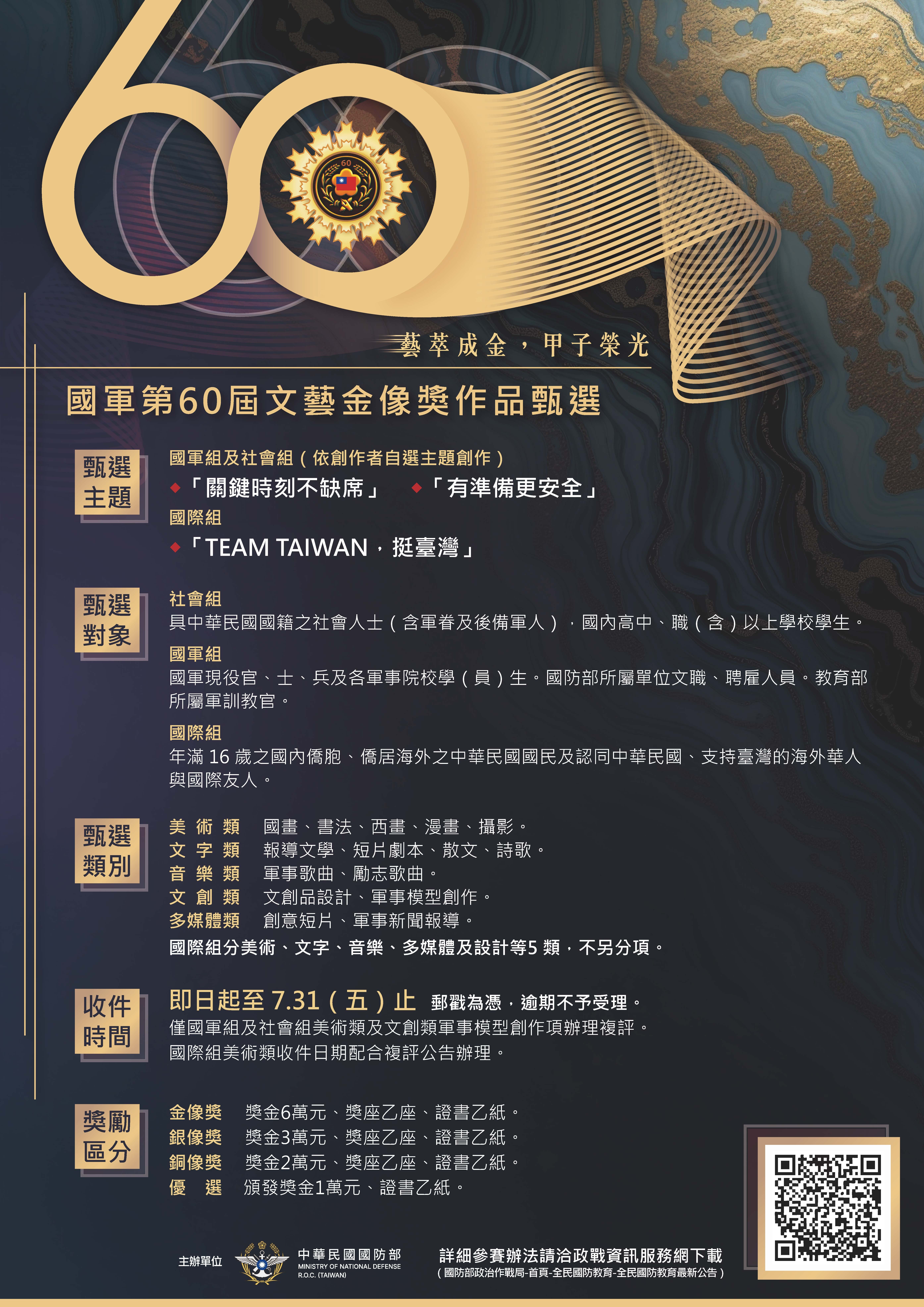 主旨:檢送「國軍第60屆文藝金像獎」作品甄選規定,請查 照。 說明: 一、為推廣全民國防理念,凝聚全民防衛共識,惠請協助運用 所屬文宣平臺宣導,甄選規定請轉發所屬單位,並鼓勵同 仁報名參加;活動資訊請逕至全民國防教育網 (https://aode.mnd.gov.tw)下載運用。 二、本件屬一般公務資訊。